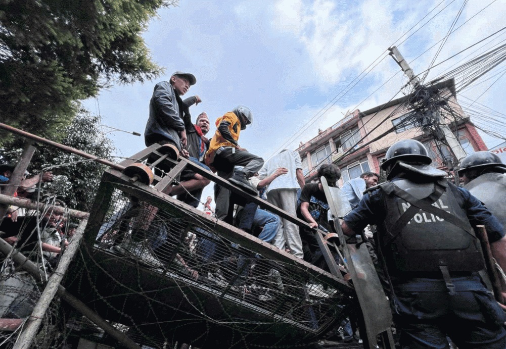 विरोधमा प्रदर्शनमा उत्रिएका जेन-जीले बानेश्वरतर्फको निषेधित क्षेत्र तोडेका छन्। यहाँ प्रहरीले ब्यारीकेड राखेर निषेधित क्षेत्र छुट्याएको थियो। तर प्रदर्शनकारीहरूले धकेलाधकेल गर्नेक्रममा ब्यारीकेड तोडेका हुन्। भीड नियन्त्रण गर्न प्रहरीले पानीको फोहरा प्रहार गरेको छ।