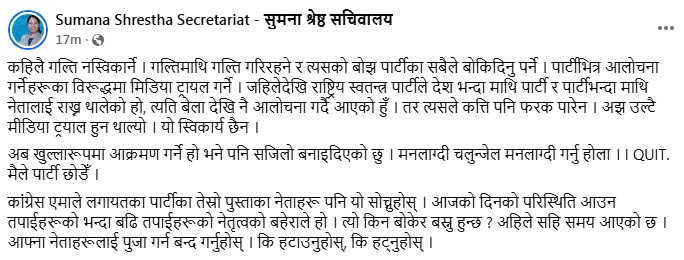 सुमनाले रास्वपा छोडेको घोषणा गर्दै भनिन्, “अब खुल्लारुपमा आक्रमण गर्न चाहे पनि सजिलो बनाइसकेको छु। मनलाग्दी चल्न चाहेको बेला त्यसो गर्नुहोला। मैले पार्टी छाडेँ।”