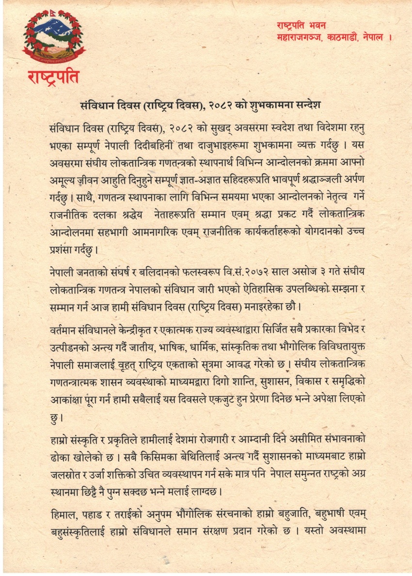 संविधान दिवसका अवसरमा शुभकामना आज सन्देश दिँदै उनले सङ्घीय लोकतान्त्रिक गणतन्त्रात्मक शासन व्यवस्थाको माध्यमद्वारा दिगो शान्ति, सुशासन, विकास र समृद्धिको आकाङ्क्षा पूरा गर्न हामी सबैलाई एकजुट हुन प्रेरणा दिनेछ भनी शुभकामना व्यक्त गरेका छन् ।