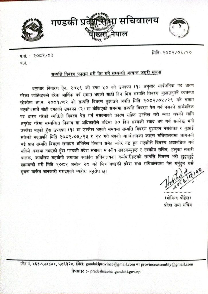 पोखरा । गण्डकी प्रदेश सभा सचिवालयले सम्पत्ति विवरण फाराम पुनः पेस गर्न अत्यन्त जरुरी सूचना जारी गरेको छ ।