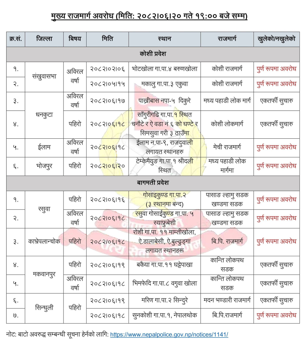 नेपाल प्रहरीले साँझ ७ बजे जारी गरेको सूचनामा मध्यपहाडी लोकमार्गको धनकुटा पाख्रिबास नगरपालिका ५ ढिकुरे र कोशी राजमार्गअन्तर्गत साँगुरीगढी गाउँपालिकाको तीन ठाउँमा रहेको अवरोध हटाइएपछि यातायात एकतर्फी सञ्चालनमा आएको उल्लेख छ ।