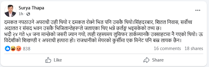 बालेनले दमकलले आगो निभाउँदै गरेको भिडियोसमेत राखेर भीडले सिंहदरबारमा आगो निभधाउन नदिएको र भित्रै भएको सेनाको दमकललाई समेत जान नदिएको पनि बताएका छन् ।