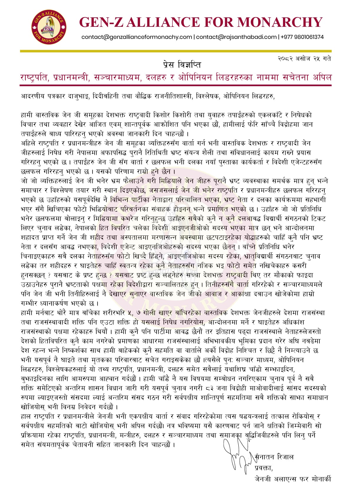 जेन जेड अलाइन्स फर मोनार्कीका प्रवक्ता सनातन रिजालले शनिवार राष्ट्रपति,प्रधानमन्त्री,सञ्चारमाध्यम र विचार निर्माताहरूका नाममा जारी गरेको अपिलमा जेनजी आन्दोलन हाई ज्याक गर्नेहरूलाई महत्त्व नदिन भनिएको छ ।