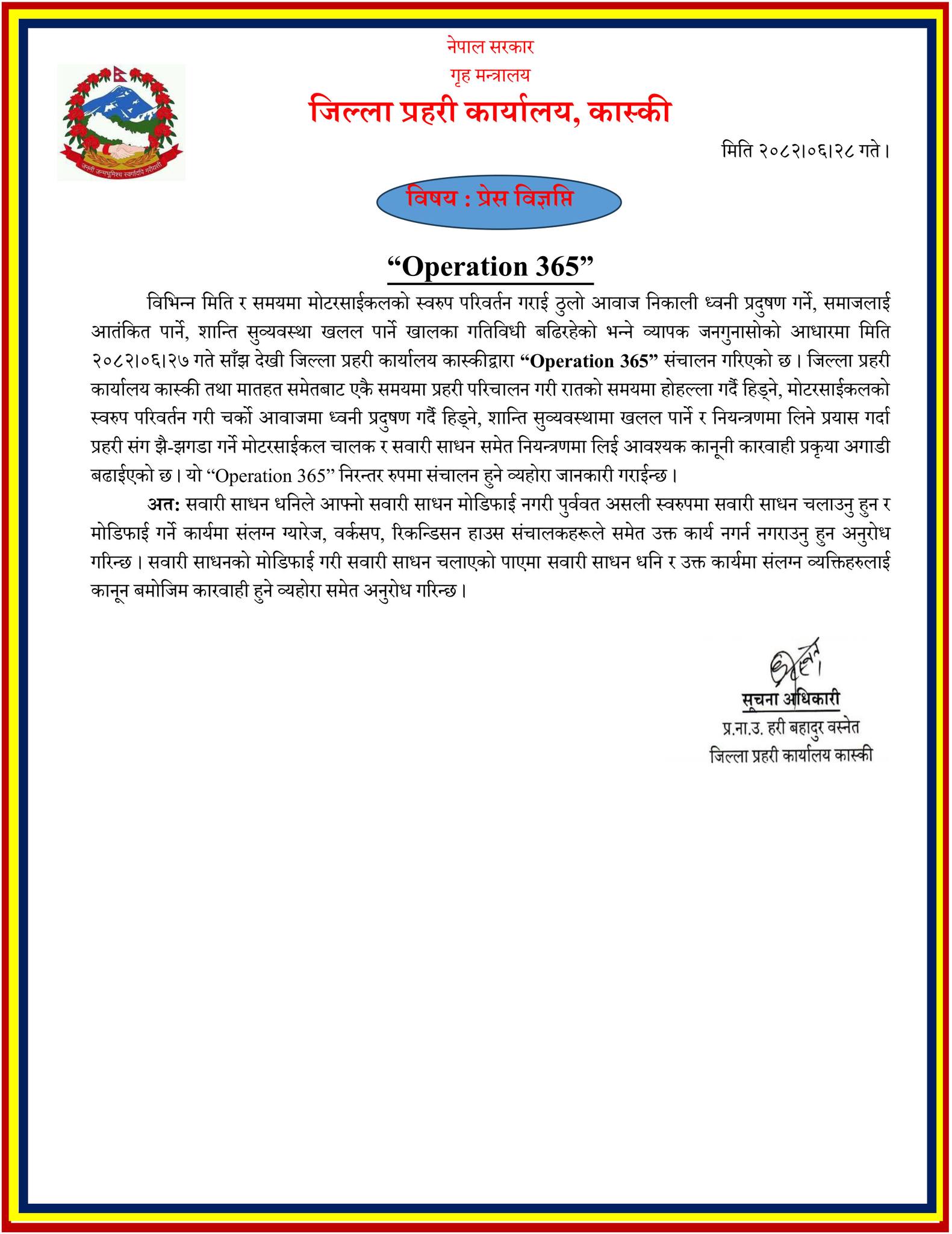 स्वरूप परिवर्तन गरेका मोटरसाइकलबाट शहरमा आतंक सिर्जना भएको गुनासोपछि कास्की प्रहरीले अपरेसन ३६५ सञ्चालन गरेको जनाएको छ ।