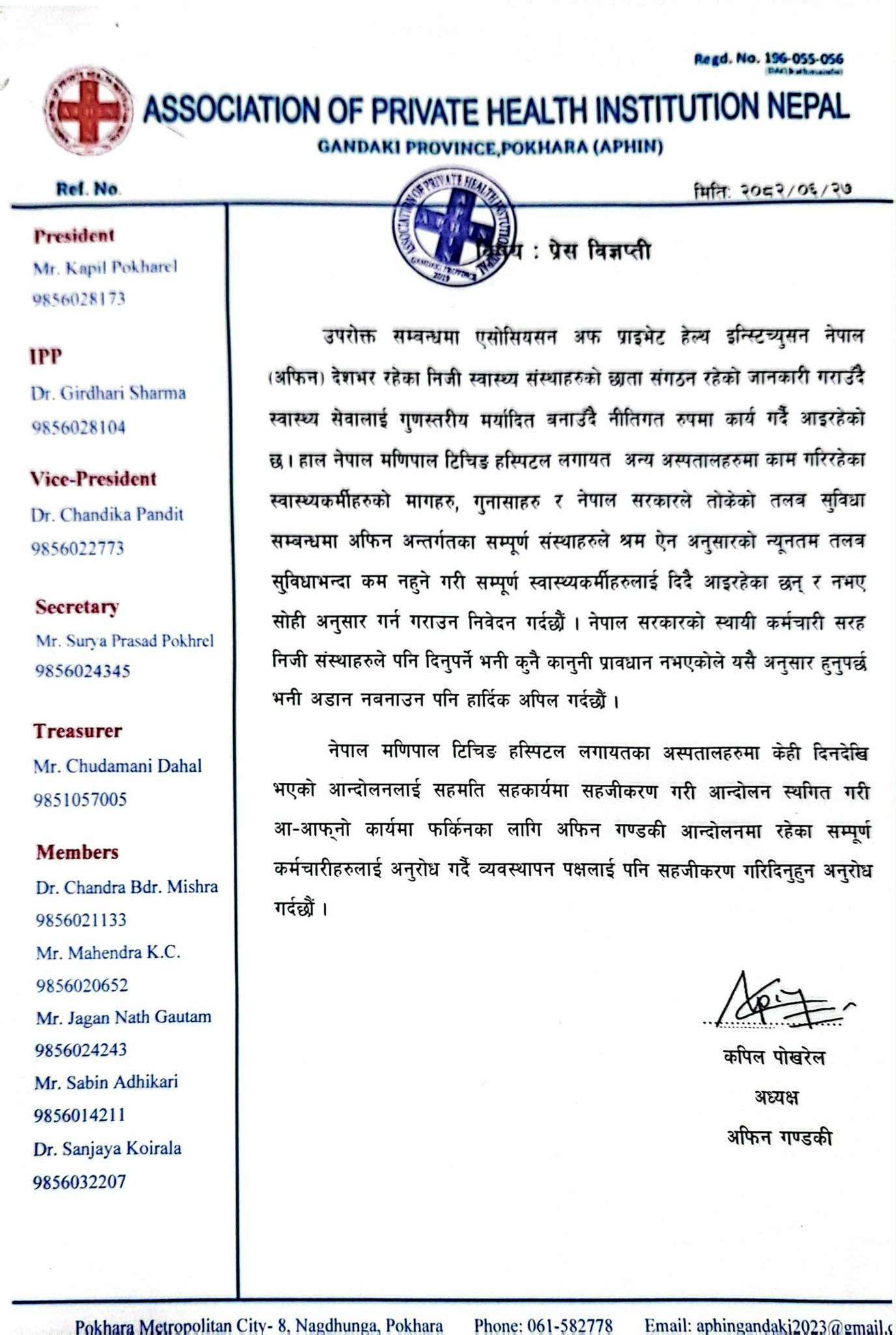 निजी अस्पताल सञ्चालकहरुको साझा संस्था एसोसिएसन अफ प्राइभेट हेल्थ इन्स्टिच्युसन नेपाल (अफिन) गण्डकीले बुधबार पोखरामा पत्रकार सम्मेलन गरी निजी अस्पतालले श्रम ऐन अनुसार तलब दिँदै आएको बताउँदै स्वास्थ्य मन्त्रालयले दिएको निर्देशन अनुसार तलब दिन नसक्ने घोषणा गरेको हो । स्वास्थ्य मन्त्रालयले गत वर्ष असोजमा नै सबै स्वास्थ्य संस्था र अस्पताललाई सरकारी सेवामा कार्यरत नर्सको दरअनुसार पारिश्रमिक दिन निर्देशन दिएको थियो ।