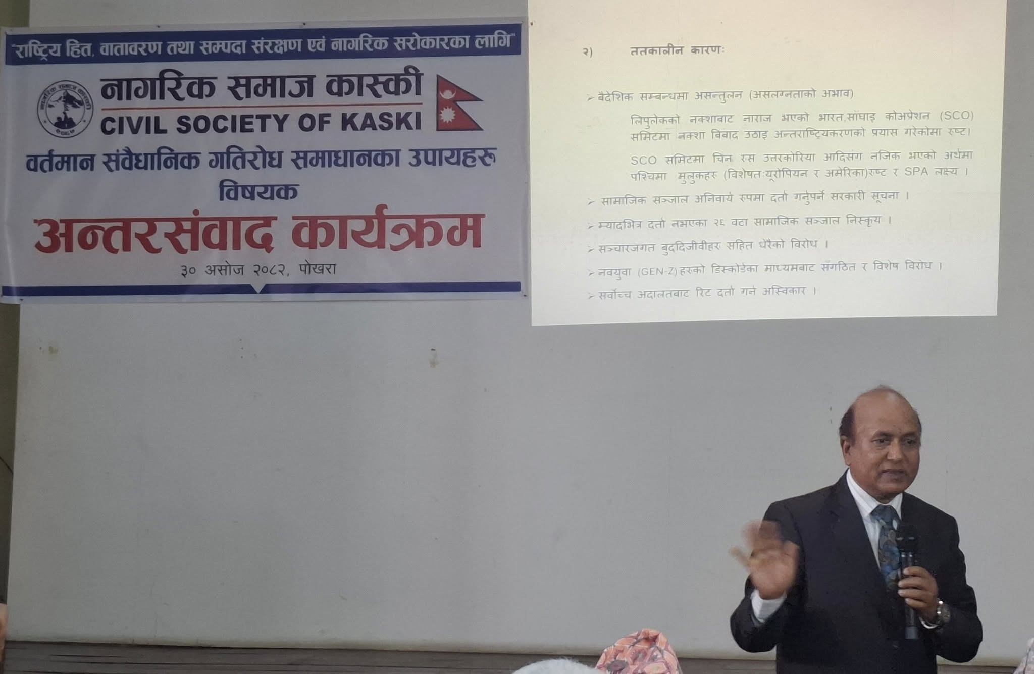 यसैक्रममा नागरिक समाज कास्कीले ‘वर्तमान संवैधानिक गतिरोध समाधानका उपायहरु’ विषयक अन्तरसंवाद कार्यक्रम गरेको छ ।