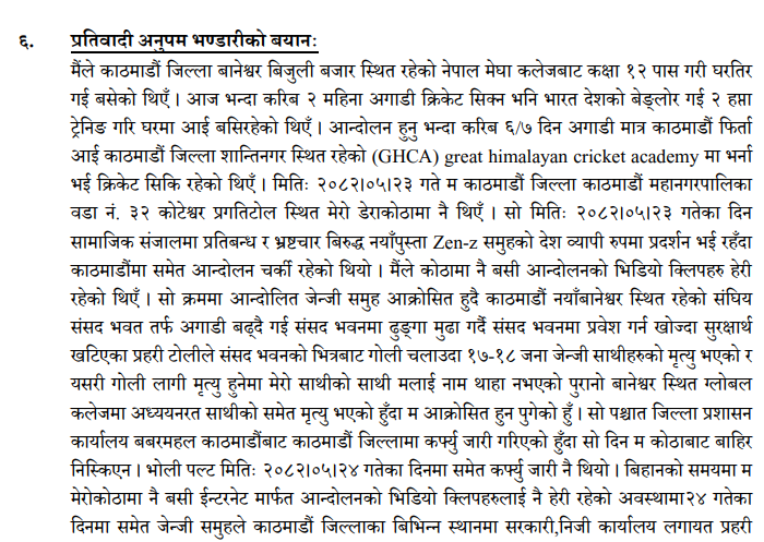 उनले प्रहरीलाई दिएको बयान अनुसार उनी २४ गते दिउँसो १२ बजेतिर आन्दोलनमा निस्किएर कोटेश्वर पुलमा पुगेका थिए। त्यहाँ आन्दोलनकारीले प्रहरीलाई कुट्दै लखेटिरहेका थिए।