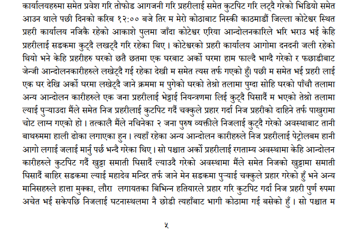 निषेधाज्ञाको समयमा ड्युटीमा खटिएका आफ्ना श्रीमान्‌को हत्यामा संलग्नलाई पक्राउ गरी कानुनी कारबाहीको माग गर्दै उनकी पत्नी कान्ती गुरुङले जाहेरी दिएकी थिइन्।