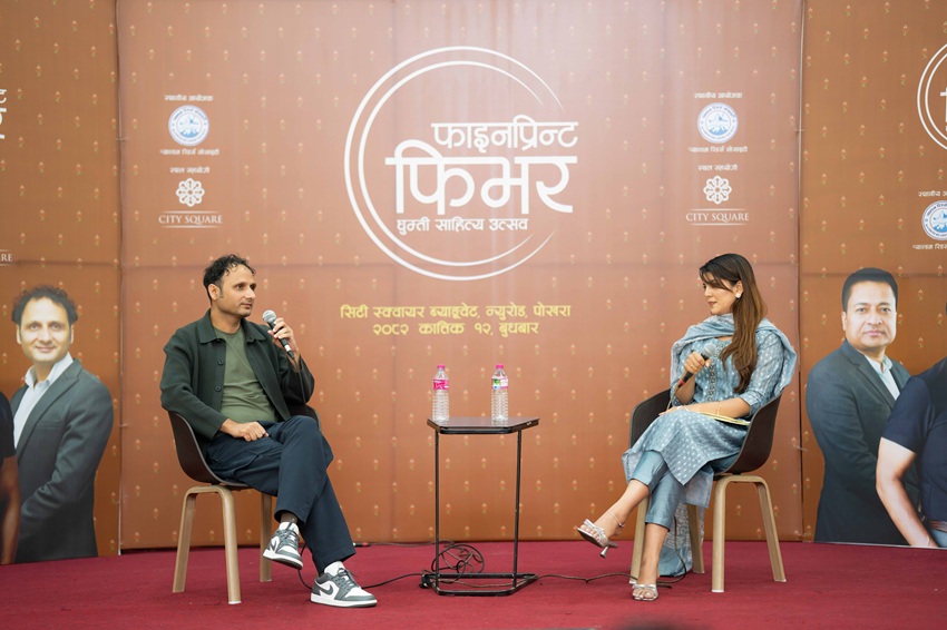 फाइनप्रिन्ट फिभर घुम्ती साहित्य उत्सवको पहिलो सेसनमा गाफिँदै थिए, सुबिन । ‘चमेलीको फूल बैजनी रुमाल’ पुस्तकमाथिको विमर्शमा सुबिनको वार्तालापमा थिइन्, अभिनेत्री सनिशा भट्टराई ।