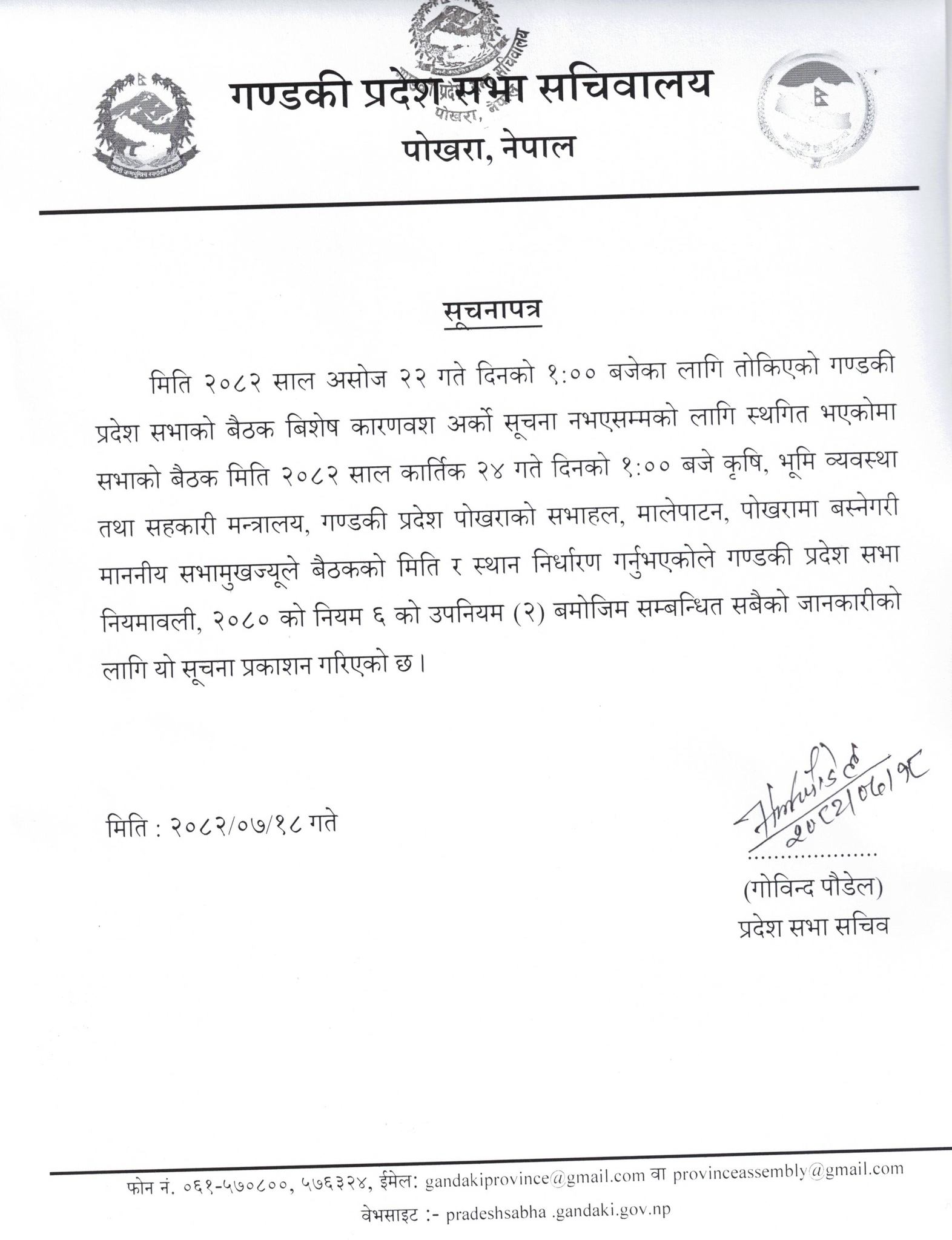 पोखरा । जेनजी आन्दोलनका कारण अनिश्चितकालका लागि स्थगित भएको गण्डकी प्रदेशसभाको बैठक कात्तिक २४ गते दिउँसो १ बजेका लागि आह्वान गरिएको छ ।