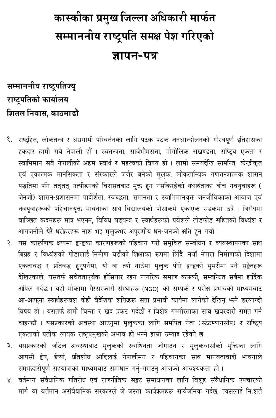 समाजले बिहीबार जिल्ला प्रशासन कार्यालय कास्कीमार्फत् राष्ट्रपतिलाई ७ बुँदे ज्ञापनपत्र बुझाउँदै जेनजीको प्रभावकारी उपस्थितिका लागि सशर्त संसद पुनःस्थापना गर्नुपर्ने माग गरिएको छ।