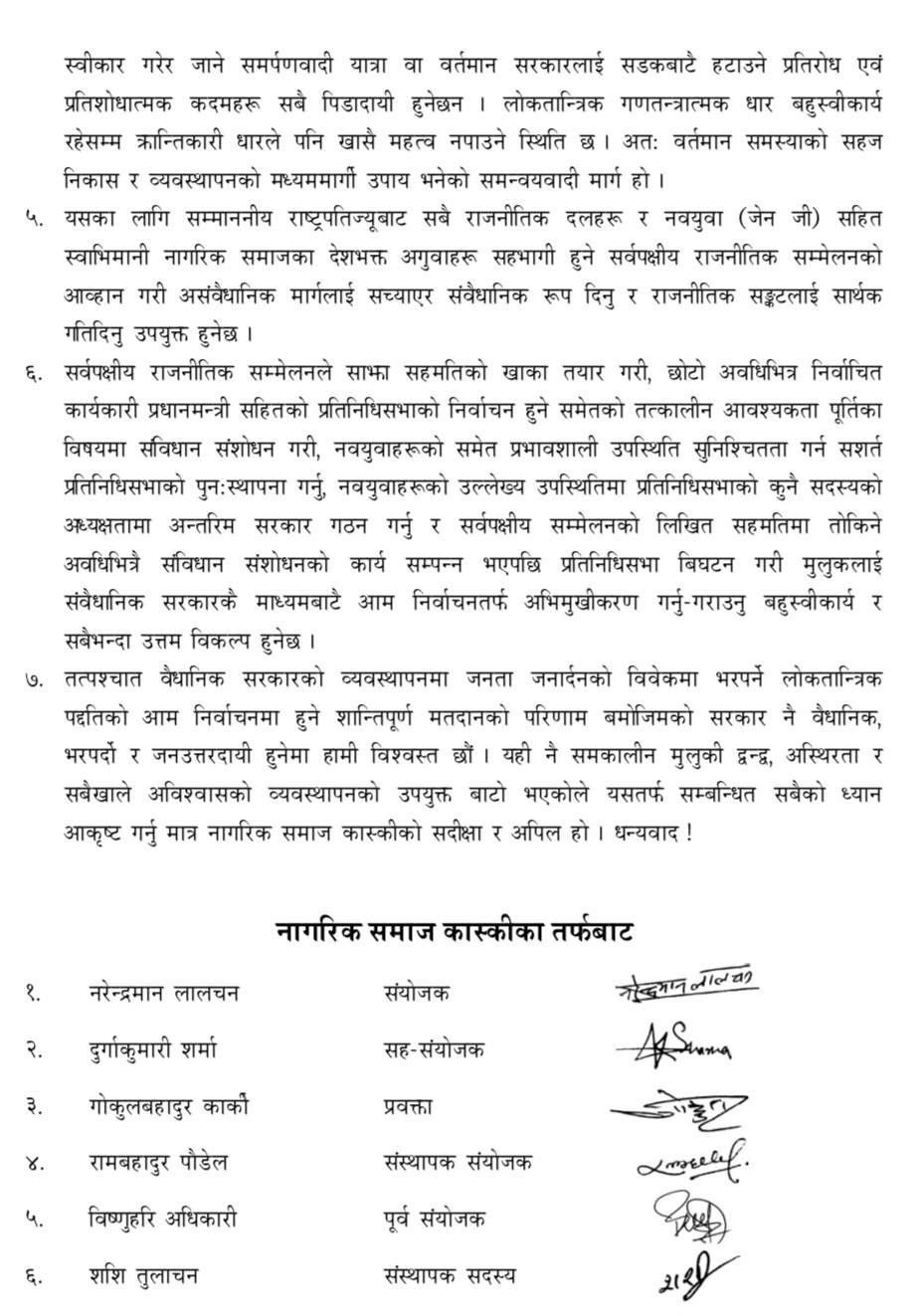 नेपालको वर्तमान राजनीतिक गतिरोध अन्त्यका लागि समन्वयवादी समाधानको आवश्यकतामा जोड दिएको छ। सर्वपक्षीय राजनीतिक सम्मेलनको आह्वान गरेको छ। यस सम्मेलनमा सबै राजनीतिक दल, जेनजी र देशभक्त नागरिक समाजका अगुवाहरूलाई समावेश गरेर असंवैधानिक मार्गलाई संवैधानिक रूप दिन सकिने नागरिक समाज कास्कीले जनाएको छ।