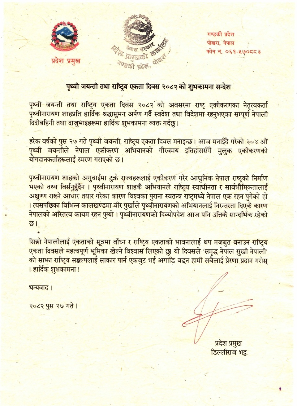 पृथ्वी जयन्ती तथा राष्ट्रिय एकता दिवस २०८२ को अवसरमा शुभकामना सन्देशमार्फत् राष्ट्र एकीकरणका नेतृत्वकर्ता पृथ्वीनारायण शाहप्रति हार्दिक श्रद्धासुमन अर्पण गर्दै स्वदेश तथा विदेशमा रहनुभएका सम्पूर्ण नेपाली दिदीबहिनी तथा दाजुभाइहरूमा हार्दिक शुभकामना व्यक्त गरेका छन् ।