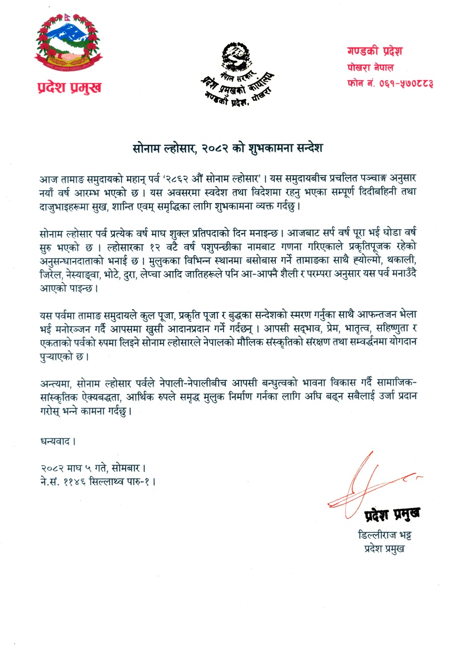पोखरा । गण्डकी प्रदेशका प्रमुख डिल्लीराज भट्टले तामाङ समुदायको महान् पर्व ‘२८६२ औं सोनाम ल्होसार’ का अवसरमा शुभकामना प्रदान गरेका छन् ।
