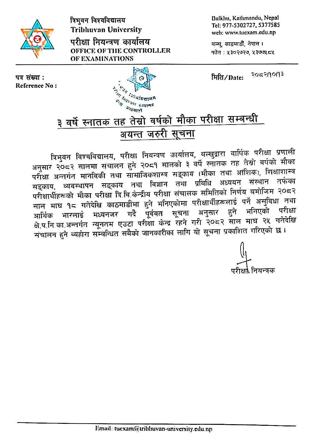 मानविकी तथा सामाजिकशास्त्र सङ्काय (मौका तथा आशिक), शिक्षाशास्त्र सङ्काय, व्यवस्थापन सङ्काय तथा विज्ञान तथा प्रविधि अध्ययन संस्थानतर्फका परीक्षार्थीहरूको मौका परीक्षा त्रिवि केन्द्रीय परीक्षा सञ्चालन समितिको निर्णयअनुसार २०८२ साल माघ १८ गतेदेखि काठमाडौंमा मात्र सञ्चालन हुने भनिएको थियो।
