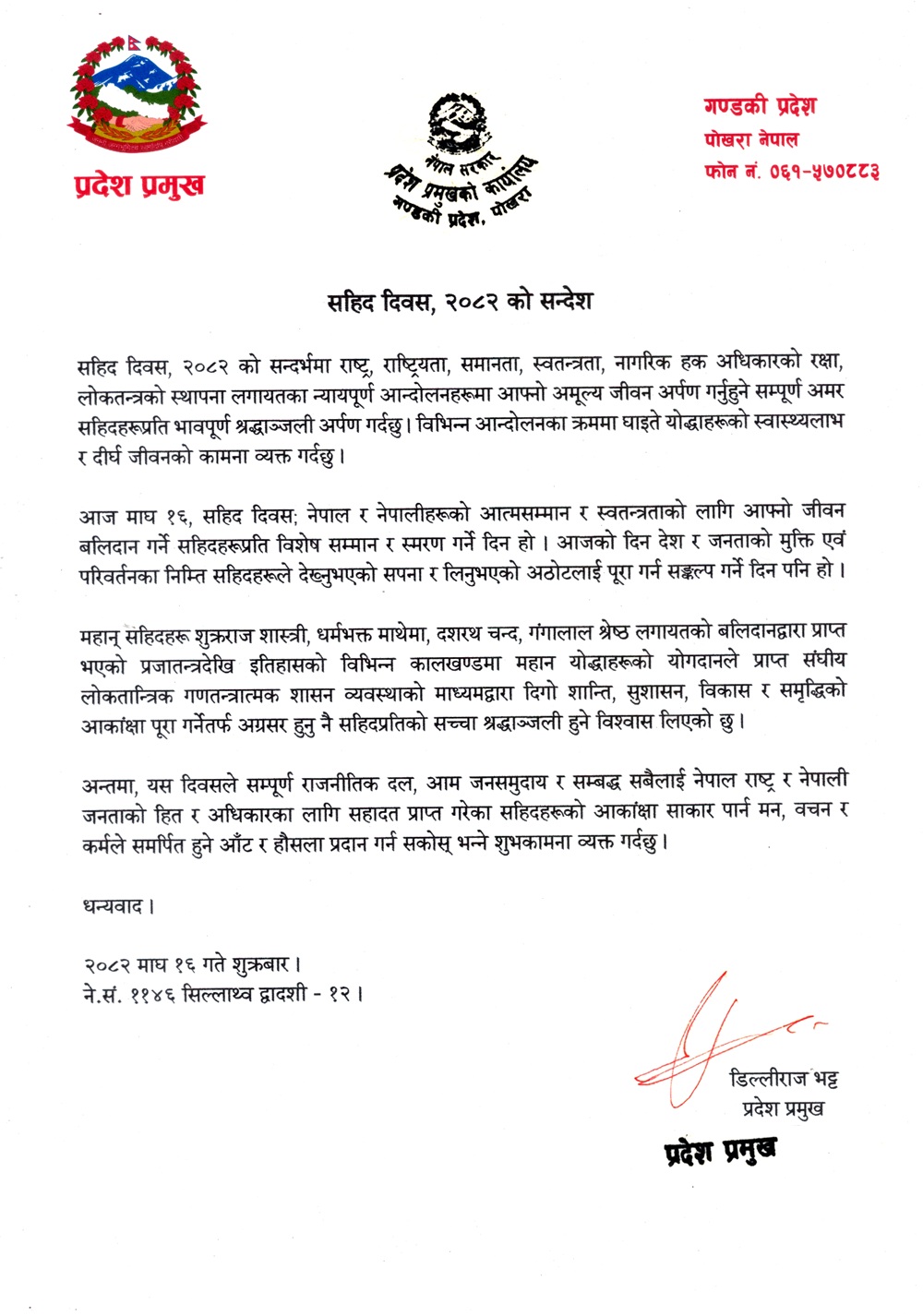 सहिद दिवस २०८२ को अवसरमा शुभकामना सन्देश जारी गर्दै प्रदेश प्रमुख भट्टले राष्ट्र, राष्ट्रियता, समानता, स्वतन्त्रता, नागरिक हक अधिकारको रक्षा, लोकतन्त्रको स्थापना लगायतका न्यायपूर्ण आन्दोलनहरूमा आफ्नो अमूल्य जीवन अर्पण गर्नुहुने सम्पूर्ण अमर सहिदहरूप्रति भावपूर्ण श्रद्धाञ्जली अर्पण गर्नुभएको छ । उनले विभिन्न आन्दोलनका क्रममा घाइते योद्धाहरूको स्वास्थ्यलाभ र दीर्घ जीवनको कामना पनि व्यक्त गरेका छन् ।