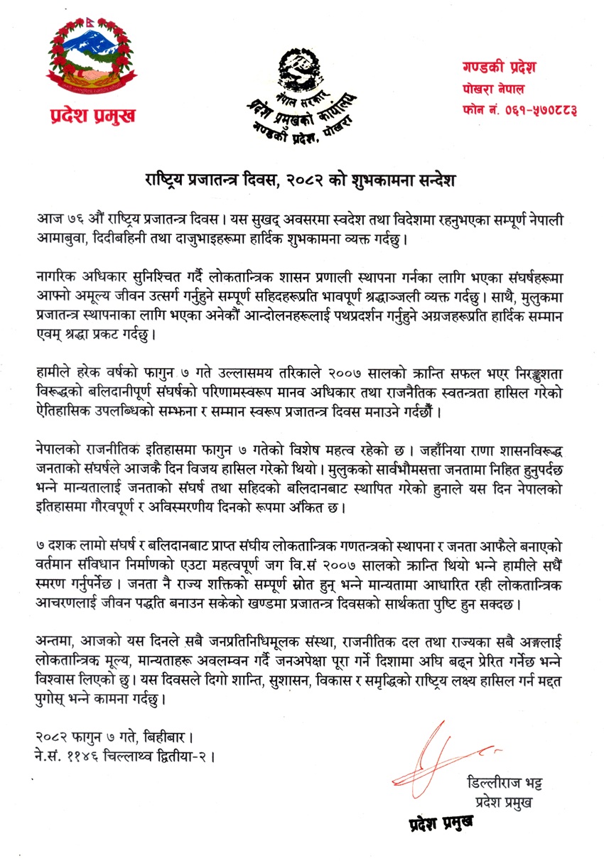 प्रजातन्त्र दिवसमा प्रदेश प्रमुख भट्टद्वारा शुभकामना