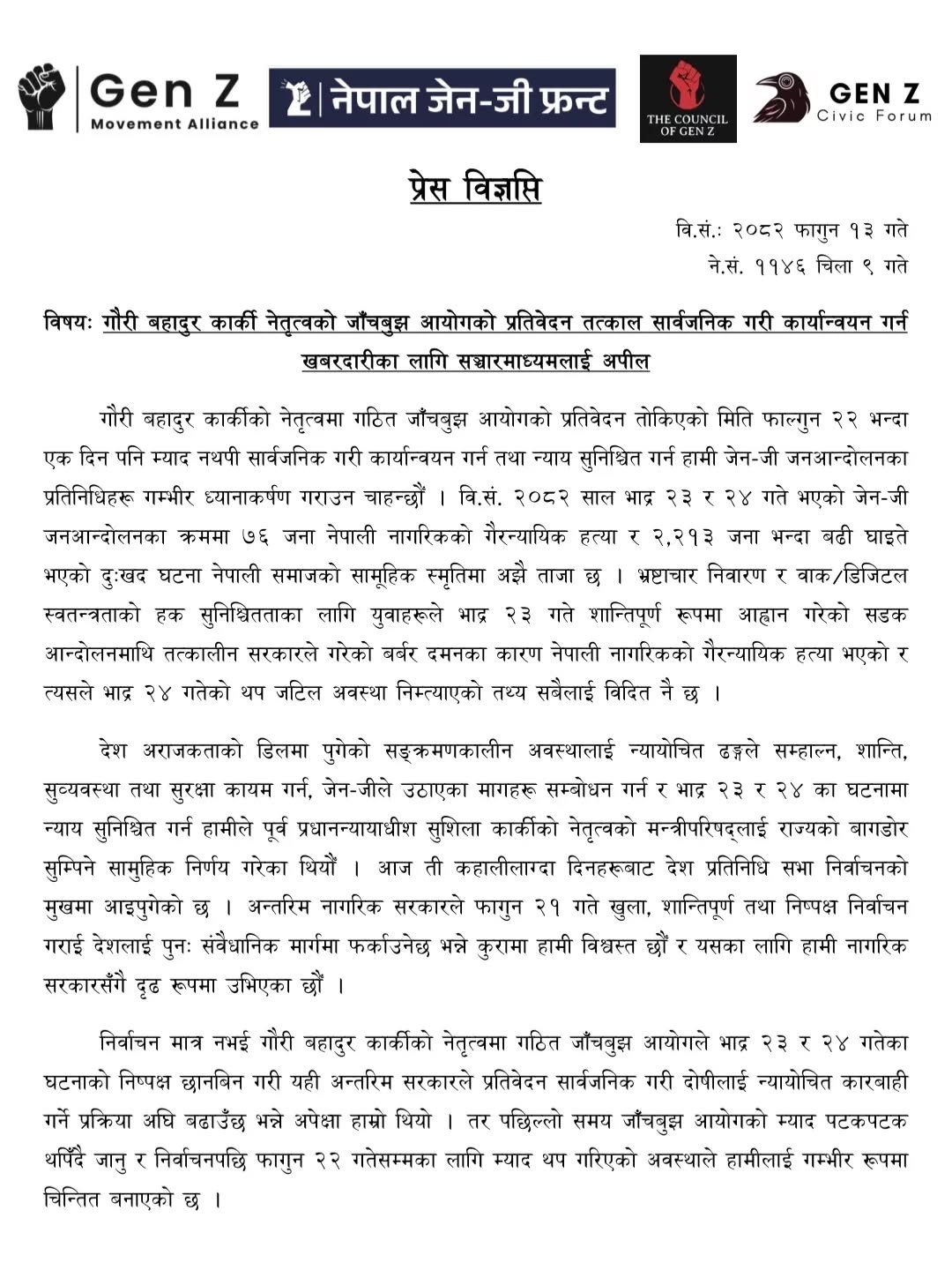 काठमाडौँ । नेपाल जेन–जी फ्रन्टले गौरी बहादुर कार्कीको नेतृत्वमा गठित जाँचबुझ आयोगको प्रतिवेदन तत्काल सार्वजनिक गरी कार्यान्वयन गर्न सरकारसँग माग गरेको छ । फ्रन्टले बुधबारबार प्रेस विज्ञप्ति जारी गर्दै माग पूरा नभए पुनः सडक आन्दोलनमा उत्रिने चेतावनी दिएको हो ।