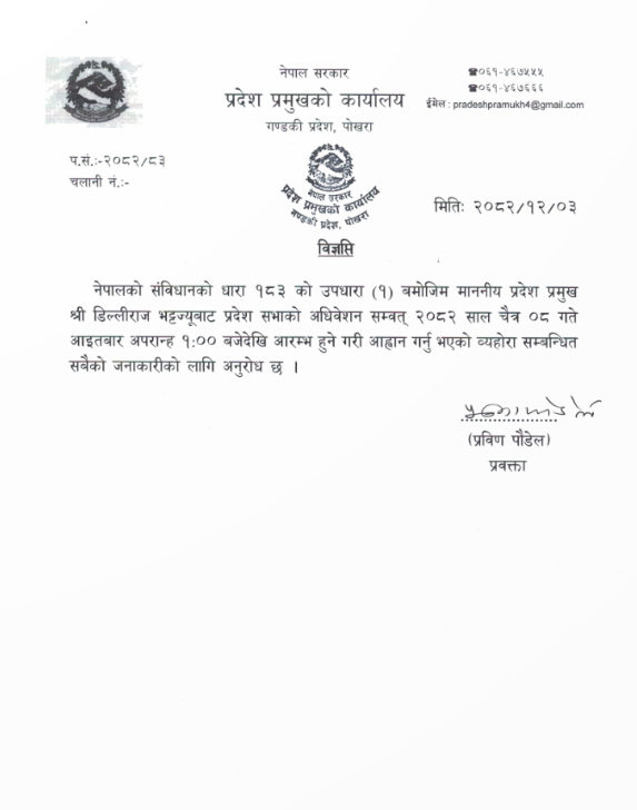 गण्डकी प्रदेशसभाको अधिवेशन आह्वान गरिएको छ ।