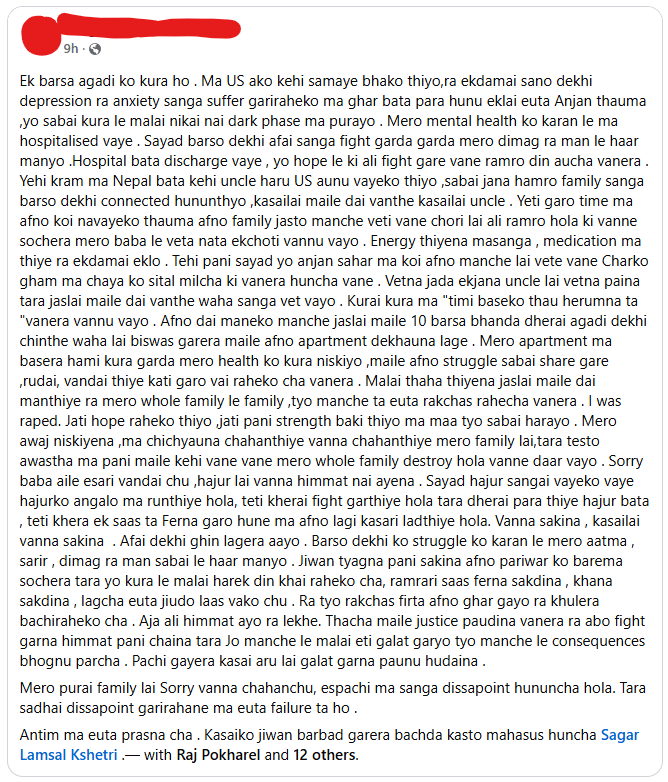 कोठामा पुगेपछि रुँदै आफूले भोगेका मानसिक पीडा सुनाइरहँदा लम्सालले जबर्जस्ती करणी गरेको युवतीको आरोप छ। सागर लम्साललाई समेत ट्याग गरिएको उक्त पोस्टअनुसार दुवै जनाबीच पारिवारिक रूपमै चिनजान थियो।