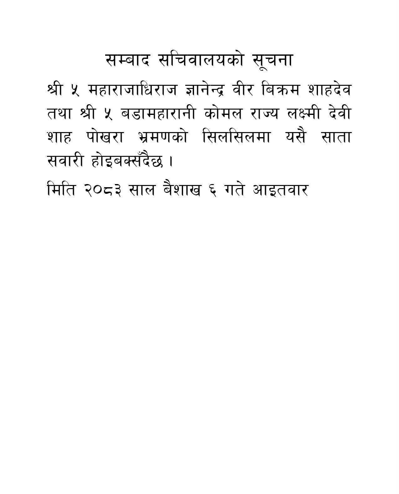 पूर्वराजा ज्ञानेन्द्र शाह र पूर्वरानी कोमल शाहले पोखरा भ्रमण गर्ने भएका छन् ।